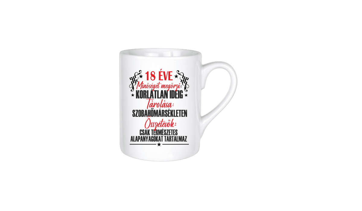 18 éve minőséget megőrzi… – kerámia bögre termékkép. Vicces bögre ajándék ötlet: Egyedi minta és felirat alapján készült, ami tökéletes ajándékként szolgál.