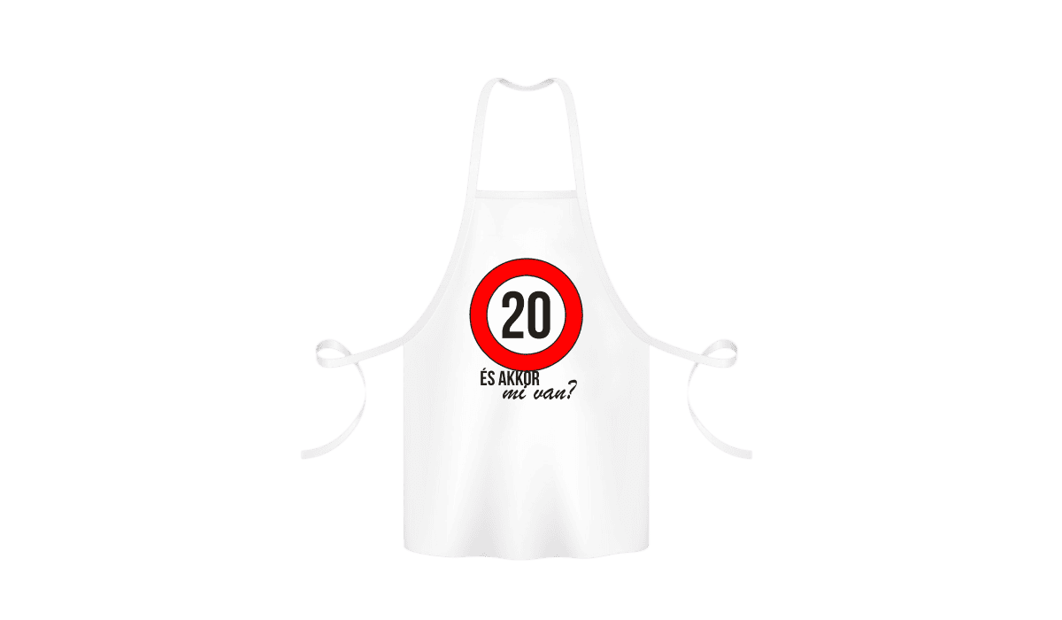 20 És akkor mi van? – kötény termékkép. Kötény ajándék ötlet: Vicces poénos kötény egyedi ajándék meglepetés, ami mosolyt csal az arcokra!