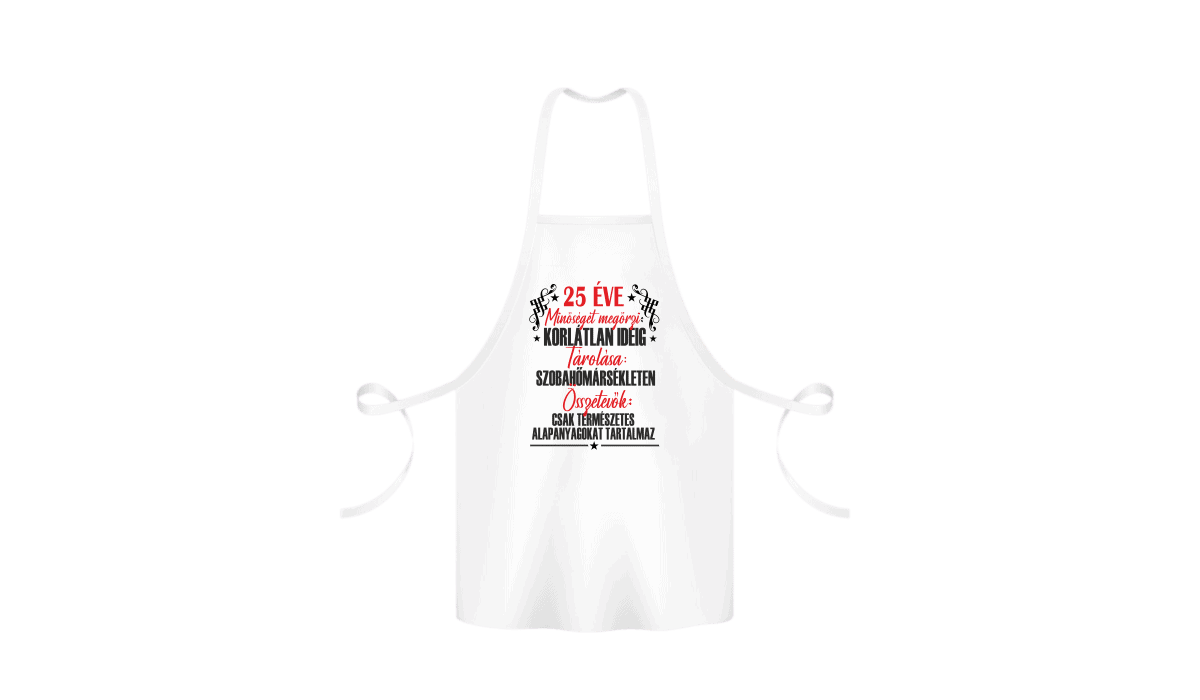 25 éve minőséget megőrzi… – kötény termékkép. Kötény ajándék ötlet: Vicces poénos kötény anyának, egyedi ajándék meglepetés, ami mosolyt csal az arcokra!