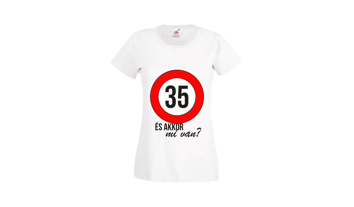 35 És akkor mi van? – női fehér póló termékkép. Tökéletes egyedi ajándék bármely alkalomra.