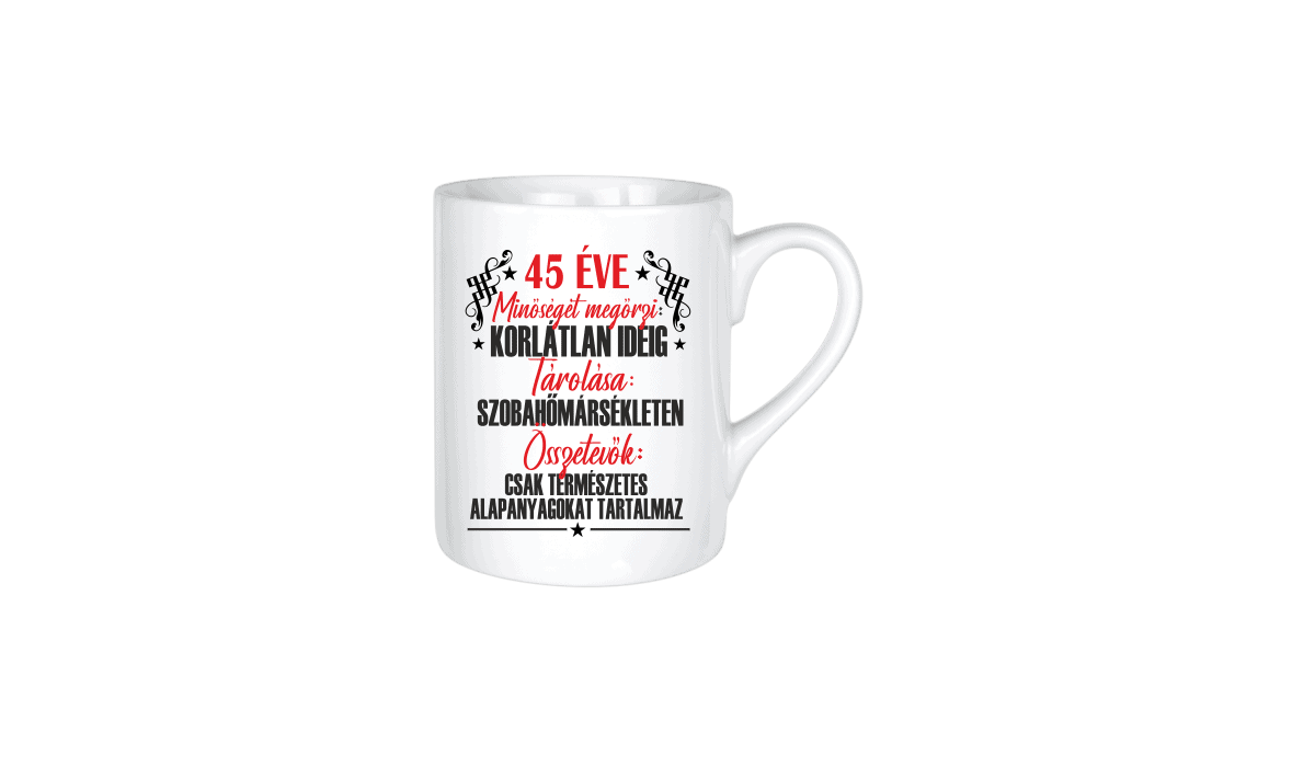 45 éve minőséget megőrzi… – kerámia bögre termékkép. Vicces bögre ajándék ötlet: Egyedi minta és felirat alapján készült, ami tökéletes ajándékként szolgál.