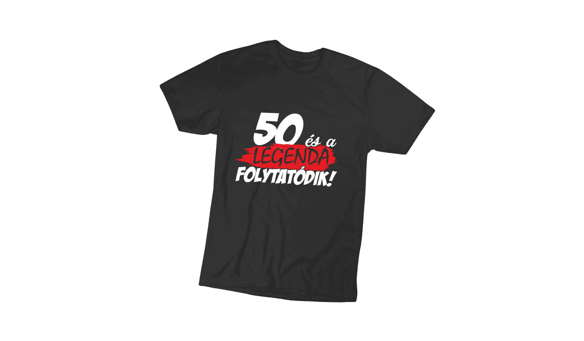 50 és a legenda folytatódik – férfi fekete póló termékkép. Tökéletes egyedi ajándék bármely alkalomra.