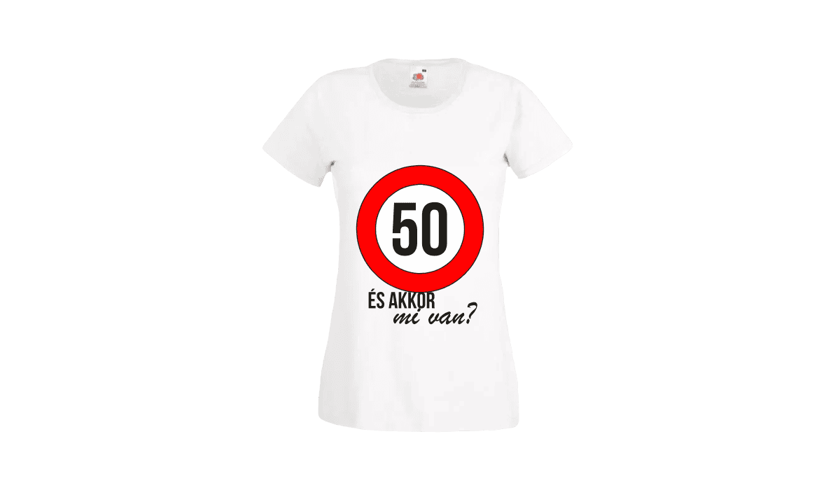 50 És akkor mi van? – női fehér póló termékkép. Tökéletes egyedi ajándék bármely alkalomra.