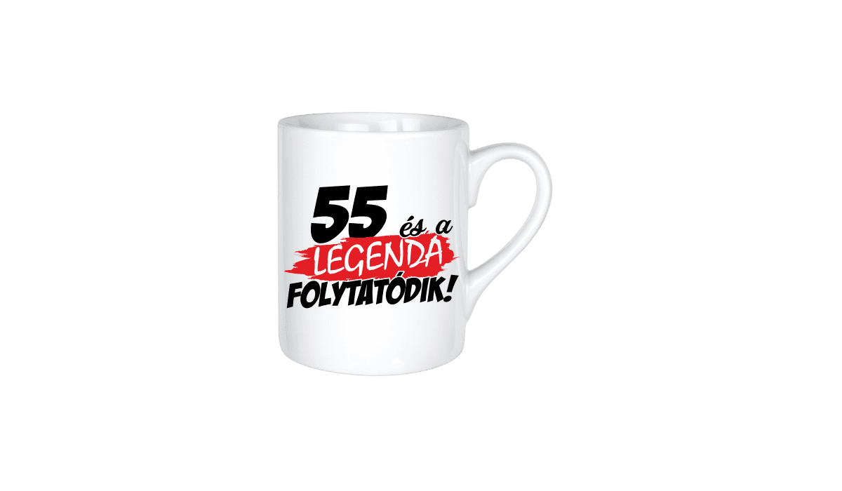 55 és a legenda folytatódik – kerámia bögre termékkép -Vicces bögre ajándék ötlet: Egyedi minta és felirat alapján készült, ami tökéletes ajándékként szolgál.