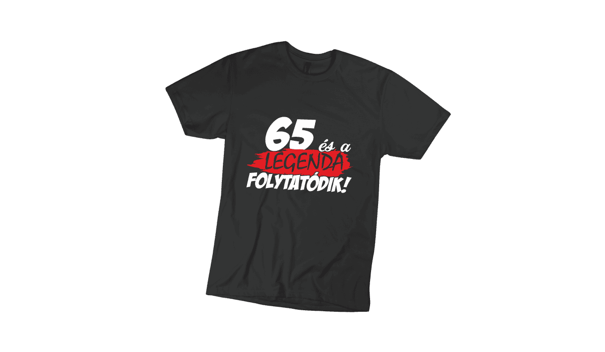 65 és a legenda folytatódik – férfi fekete póló termékkép. Tökéletes egyedi ajándék bármely alkalomra.