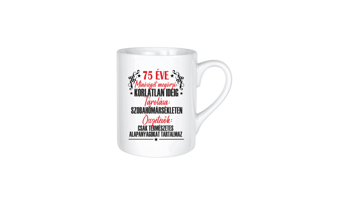 75 éve minőséget megőrzi… – kerámia bögre termékkép. Vicces bögre ajándék ötlet: Egyedi minta és felirat alapján készült, ami tökéletes ajándékként szolgál.