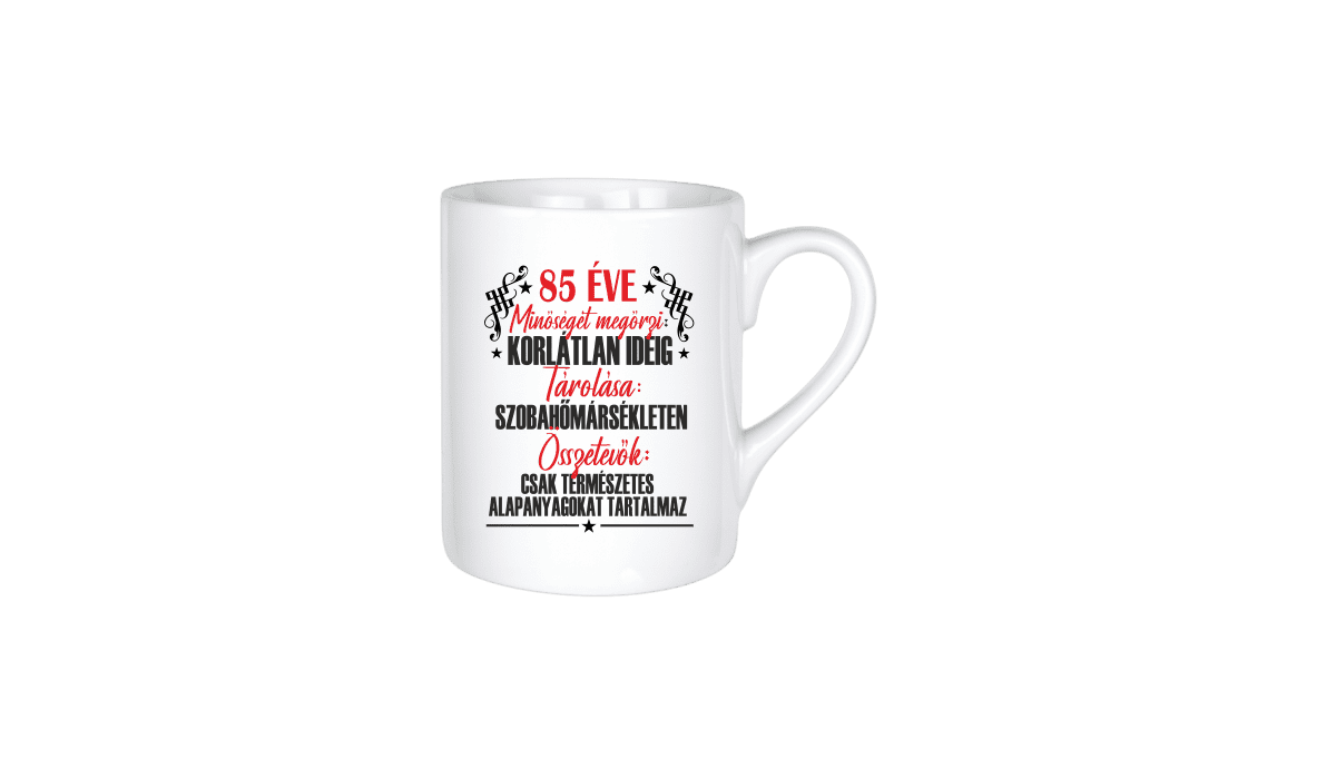 85 éve minőséget megőrzi… – kerámia bögre termékkép. Vicces bögre ajándék ötlet: Egyedi minta és felirat alapján készült, ami tökéletes ajándékként szolgál.