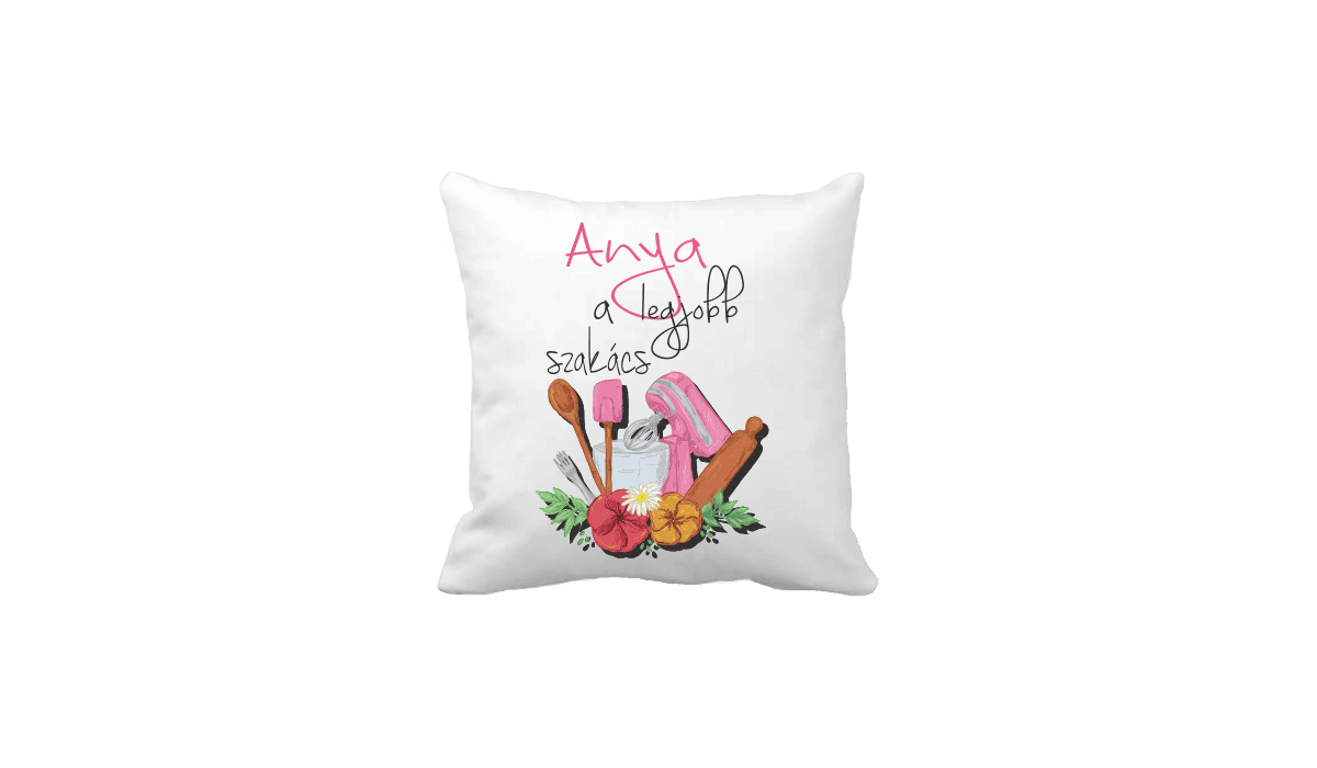 Anya a legjobb szakács – vicces poénos párna termékkép. Egyedi, fényképes minta és felirat alapján készült. Állatos,vicces,poénos,fánkos,emoji,anyának,apának, és pénzes párnák nagy választéka. Bármely alkalomra tökéletes és különleges meglepetés.