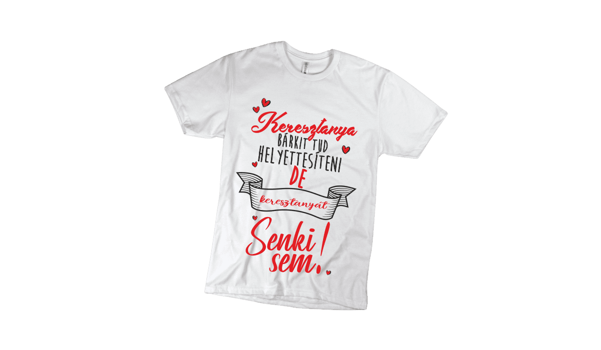 Keresztanya bárkit tud helyettesíteni… – fehér női póló termékkép. Tökéletes egyedi ajándék bármely alkalomra.