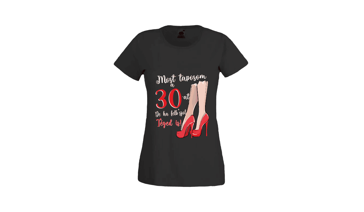 Most taposom a 30-at… – női fekete póló termékkép. Tökéletes egyedi ajándék bármely alkalomra.