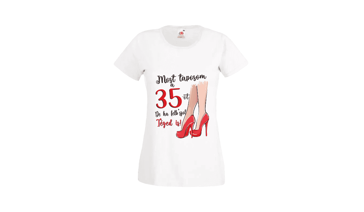 Most taposom a 35-öt… – női fehér póló termékkép. Tökéletes egyedi ajándék bármely alkalomra.