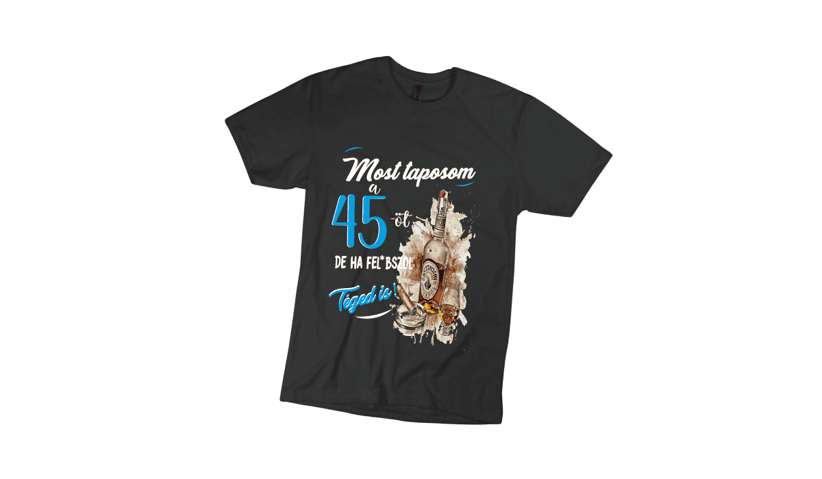 Most taposom a 45-öt… – férfi fekete póló termékkép. Tökéletes egyedi ajándék bármely alkalomra.