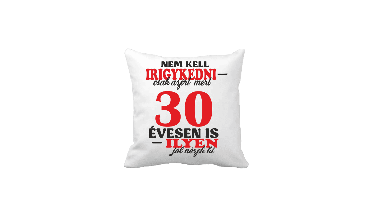 Nem kell irigykedni 30 …(piros) – vicces poénos párna termékkép. Poénos párna ajándék ötlet: Egyedi minta és felirat alapján készült, ami tökéletes ajándékként szolgál.