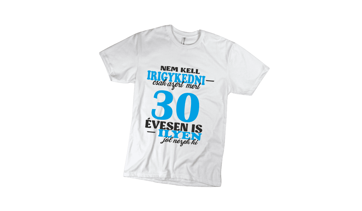 Nem kell irigykedni 30…(kék) – férfi fehér póló. Tökéletes egyedi ajándék bármely alkalomra.