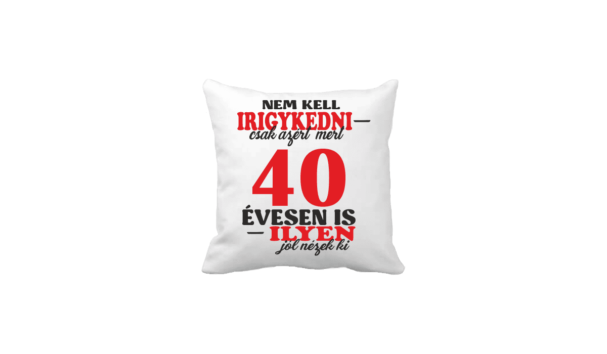 Nem kell irigykedni 40 …(piros) – vicces poénos párna termékkép. Poénos párna ajándék ötlet: Egyedi minta és felirat alapján készült, ami tökéletes ajándékként szolgál.