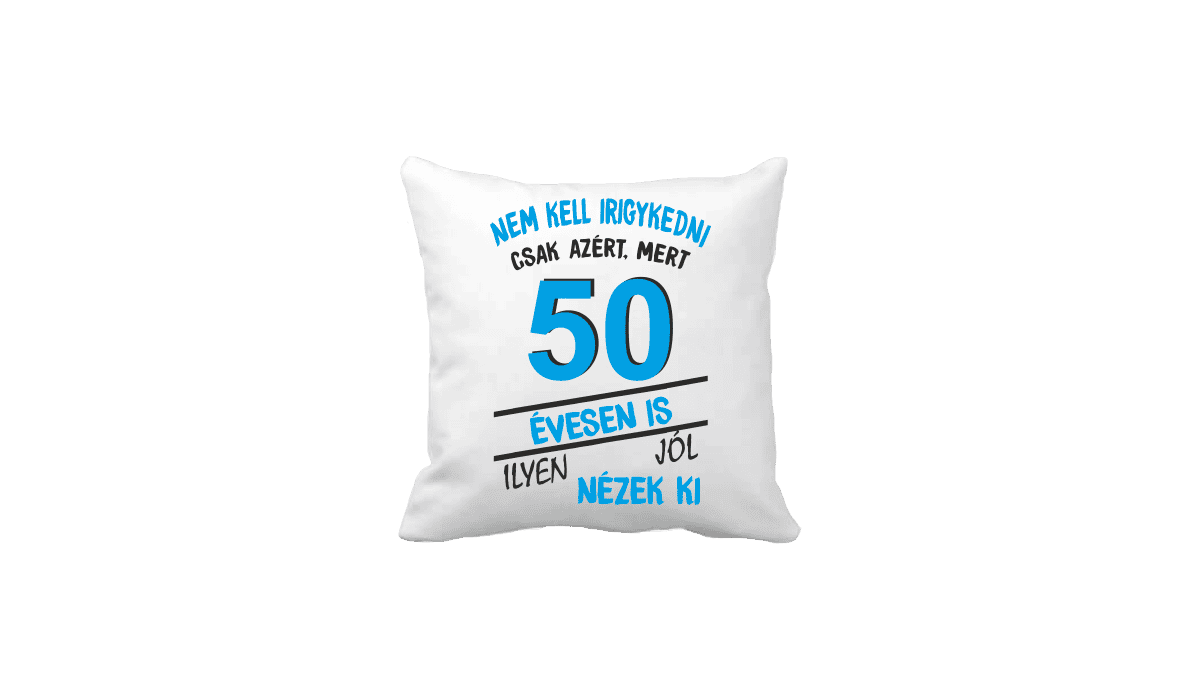 Nem kell irigykedni 50 évesen is…(kék) – vicces poénos párna termékkép. Poénos párna ajándék ötlet: Egyedi minta és felirat alapján készült, ami tökéletes ajándékként szolgál.