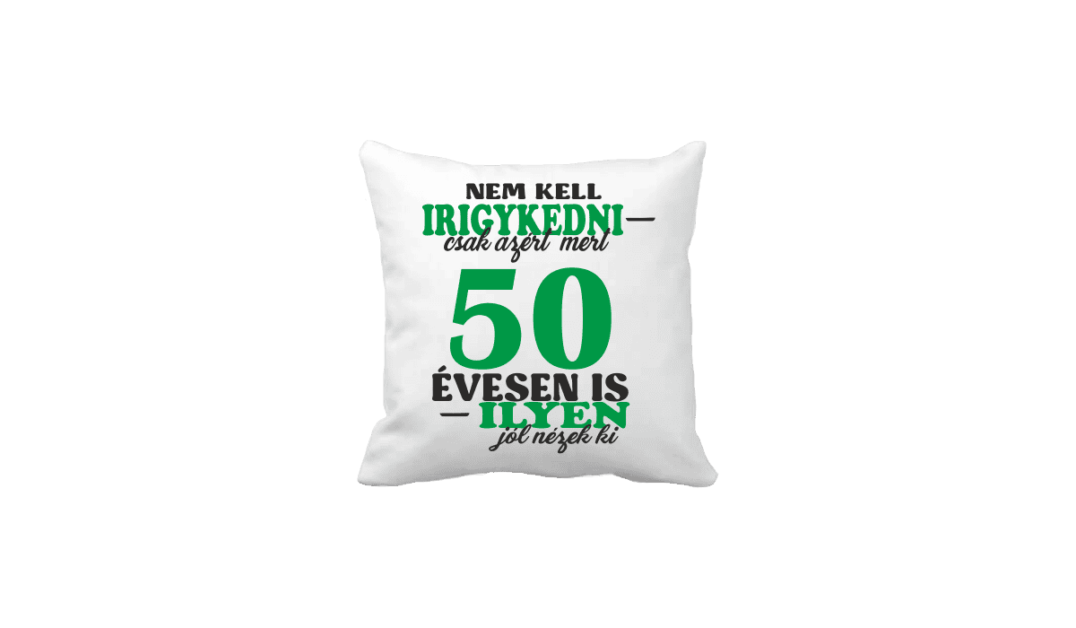 Nem kell irigykedni 50…(zöld) – vicces poénos párna termékkép. Poénos párna ajándék ötlet: Egyedi minta és felirat alapján készült, ami tökéletes ajándékként szolgál.