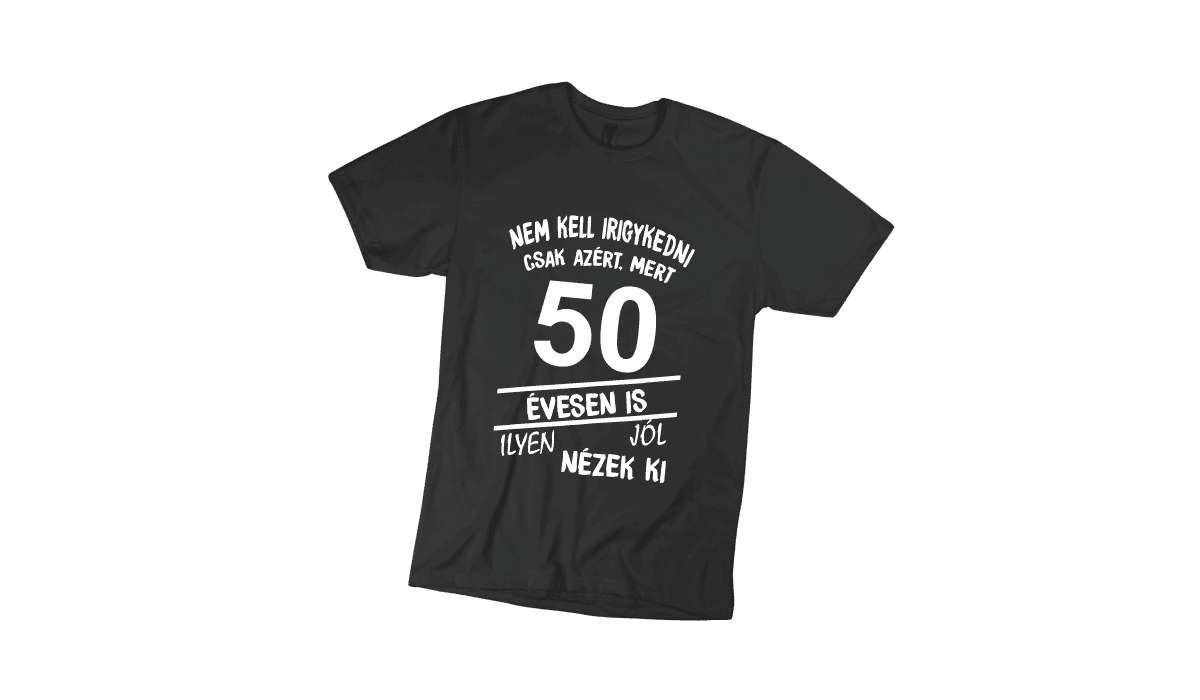 Nem kell irigykedni 50…(fehér) – férfi fekete póló termékkép. Tökéletes egyedi ajándék bármely alkalomra.