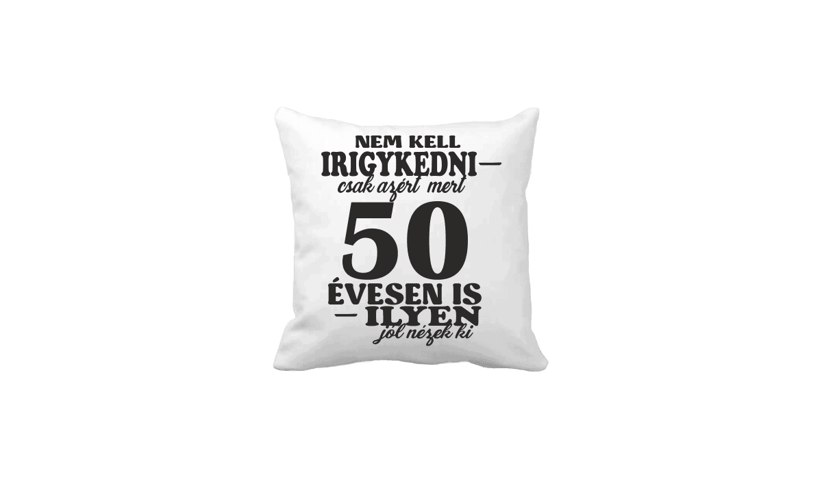 Nem kell irigykedni 50 …(fekete) – vicces poénos párna termékkép. Poénos párna ajándék ötlet: Egyedi minta és felirat alapján készült, ami tökéletes ajándékként szolgál.