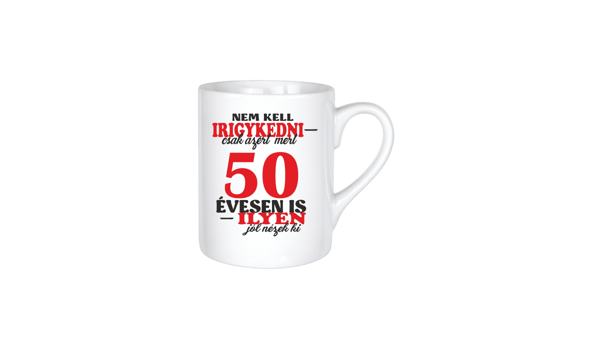 Nem kell irigykedni 50…(piros) – kerámia bögre termékkép. Vicces bögre ajándék ötlet: Egyedi minta és felirat alapján készült, ami tökéletes ajándékként szolgál.