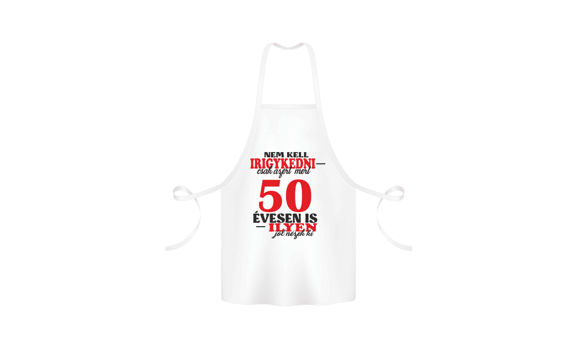 Nem kell irigykedni 50…(piros) – kötény termékkép. Kötény ajándék ötlet: Vicces poénos kötény egyedi ajándék meglepetés, ami mosolyt csal az arcokra!