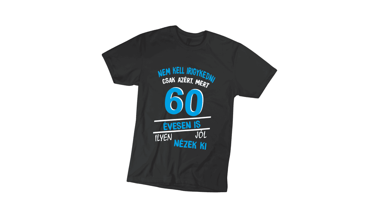 Nem kell irigykedni 60…(kék) – férfi fekete póló termékkép. Tökéletes egyedi ajándék bármely alkalomra.