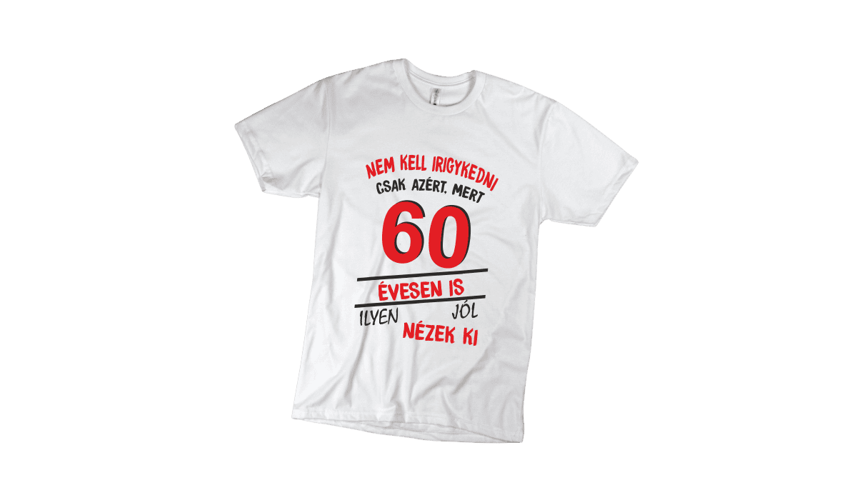 Nem kell irigykedni 60…(piros) – férfi fehér póló termékkép. Tökéletes egyedi ajándék bármely alkalomra.