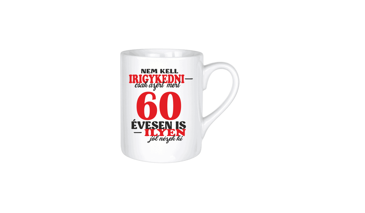 Nem kell irigykedni 60…(piros) – kerámia bögre termékkép. Vicces bögre ajándék ötlet: Egyedi minta és felirat alapján készült, ami tökéletes ajándékként szolgál.