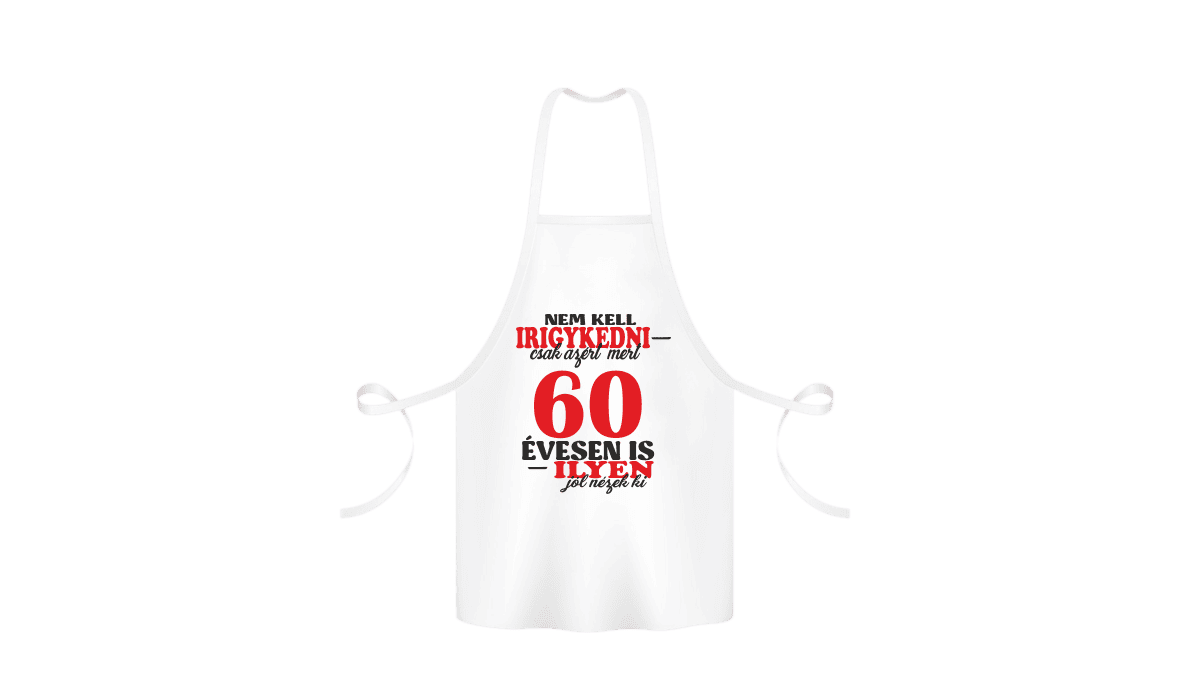 Nem kell irigykedni 60…(piros) – kötény termékkép. Kötény ajándék ötlet: Vicces poénos kötény egyedi ajándék meglepetés, ami mosolyt csal az arcokra!