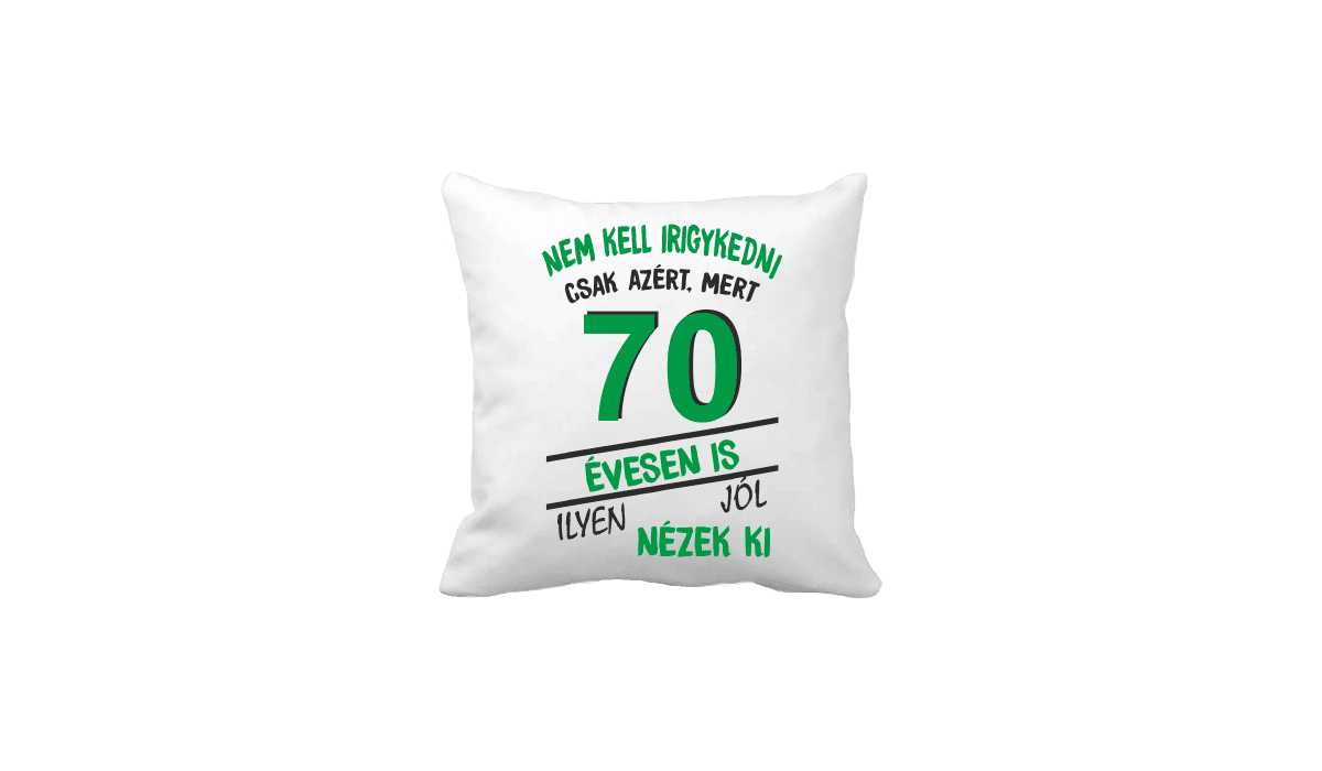 Nem kell irigykedni 70 évesen is…(zöld) – vicces poénos párna termékkép. Poénos párna ajándék ötlet: Egyedi minta és felirat alapján készült, ami tökéletes ajándékként szolgál.