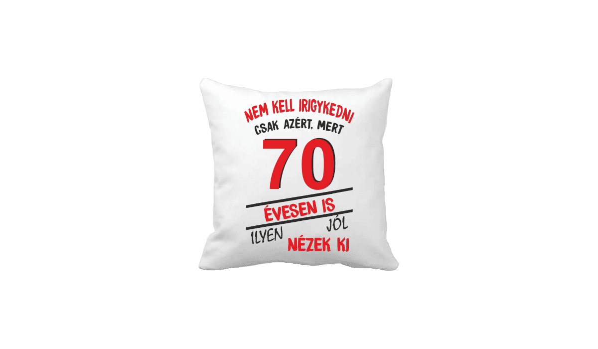 Nem kell irigykedni 70 évesen is…(piros) – vicces poénos párna termékkép. Poénos párna ajándék ötlet: Egyedi minta és felirat alapján készült, ami tökéletes ajándékként szolgál.
