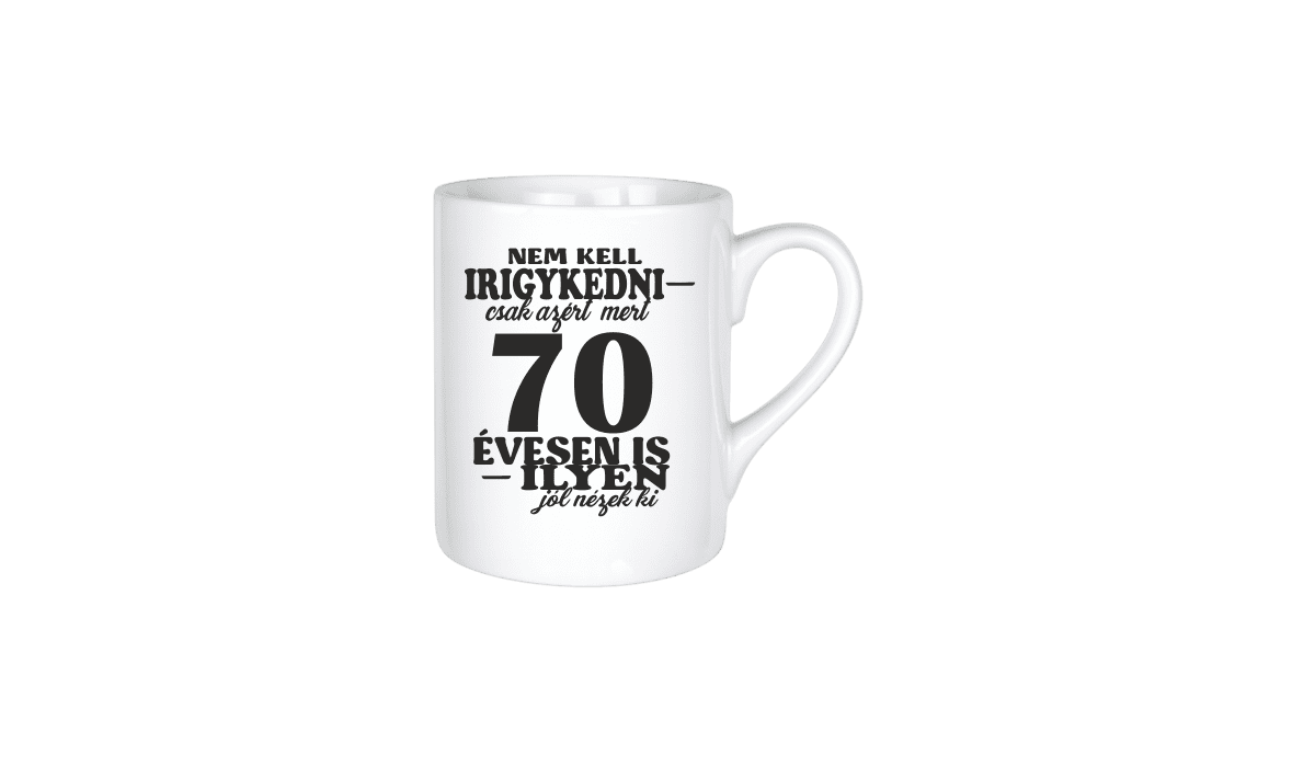 Nem kell irigykedni 70…(fekete) – kerámia bögre termékkép. Vicces bögre ajándék ötlet: Egyedi minta és felirat alapján készült, ami tökéletes ajándékként szolgál.