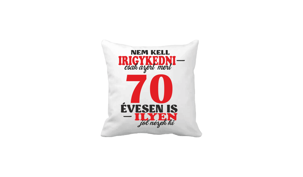 Nem kell irigykedni 70 …(piros) – vicces poénos párna termékkép. Poénos párna ajándék ötlet: Egyedi minta és felirat alapján készült, ami tökéletes ajándékként szolgál.