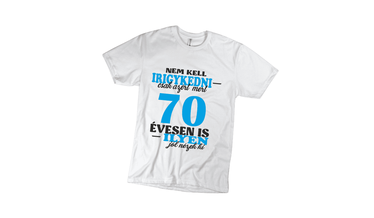 Nem kell irigykedni 70…(kék) – férfi fehér póló. Tökéletes egyedi ajándék bármely alkalomra.