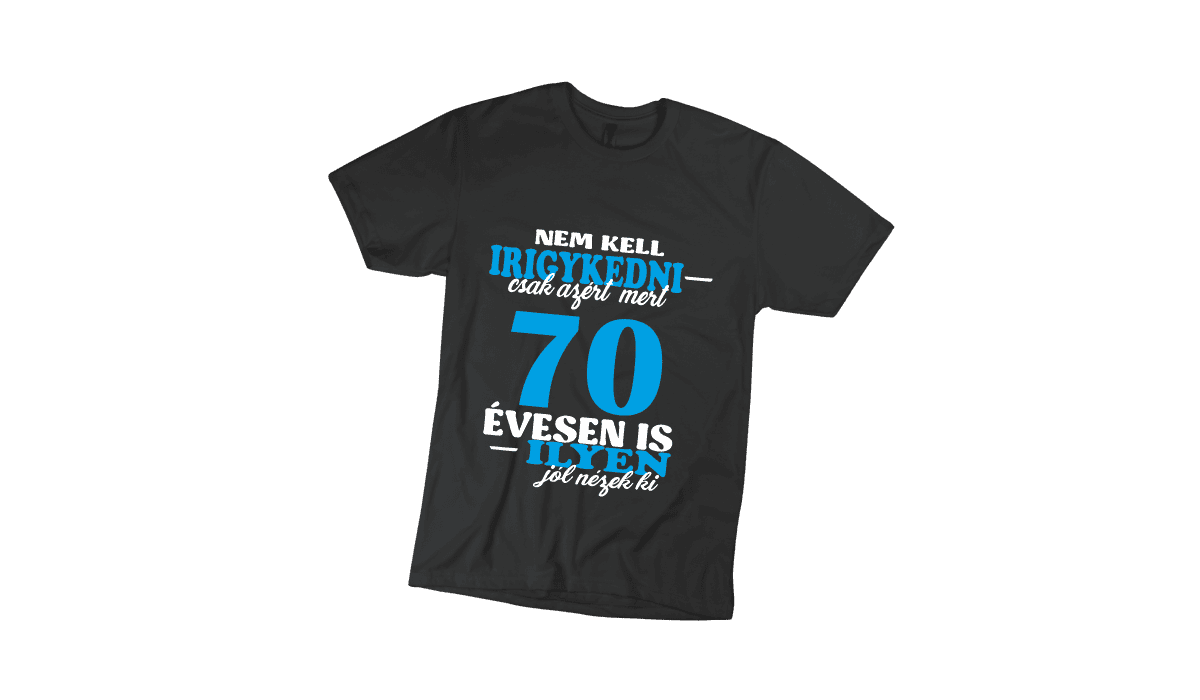 Nem kell irigykedni 70…(kék) – férfi fekete póló. Tökéletes egyedi ajándék bármely alkalomra.