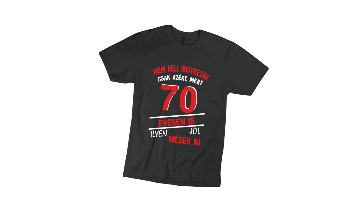Nem kell irigykedni 70…(piros) – férfi fekete póló termékkép. Tökéletes egyedi ajándék bármely alkalomra.
