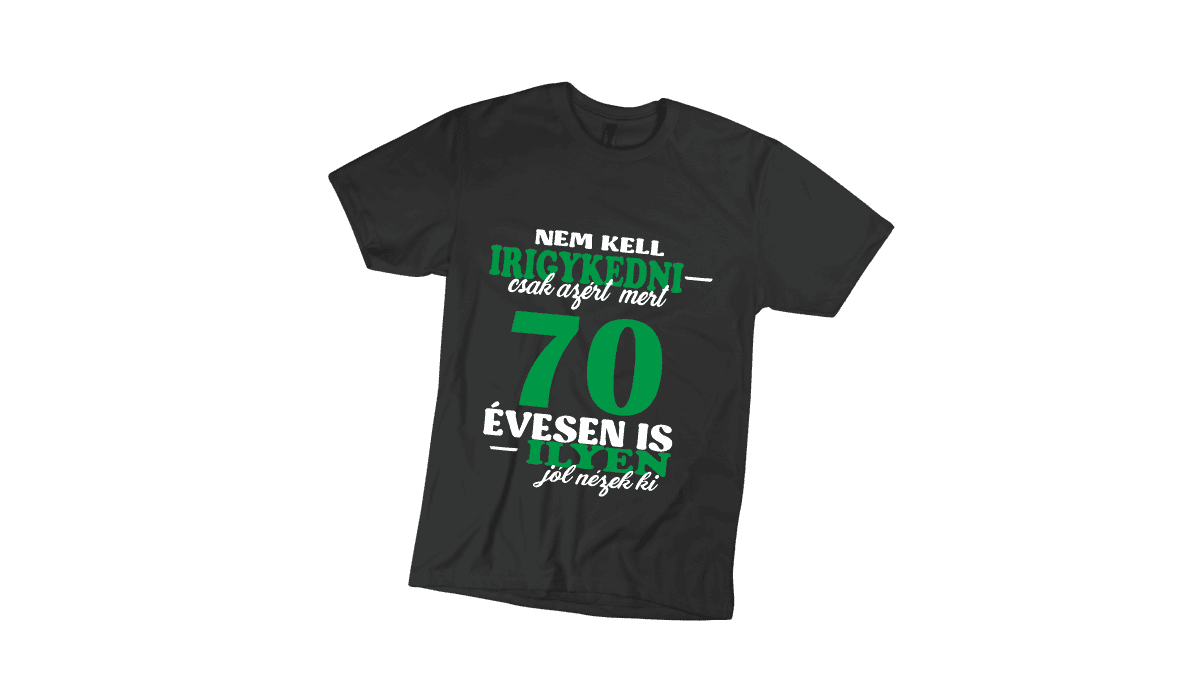 Nem kell irigykedni 70…(zöld) – férfi fekete póló. Tökéletes egyedi ajándék bármely alkalomra.