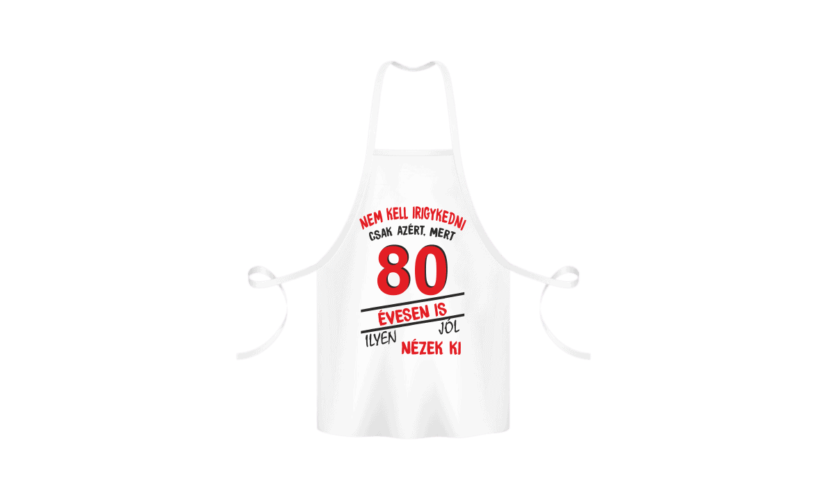 Nem kell irigykedni 80 évesen is…(piros) – kötény termékkép. Kötény ajándék ötlet: Vicces poénos kötény egyedi ajándék meglepetés, ami mosolyt csal az arcokra!