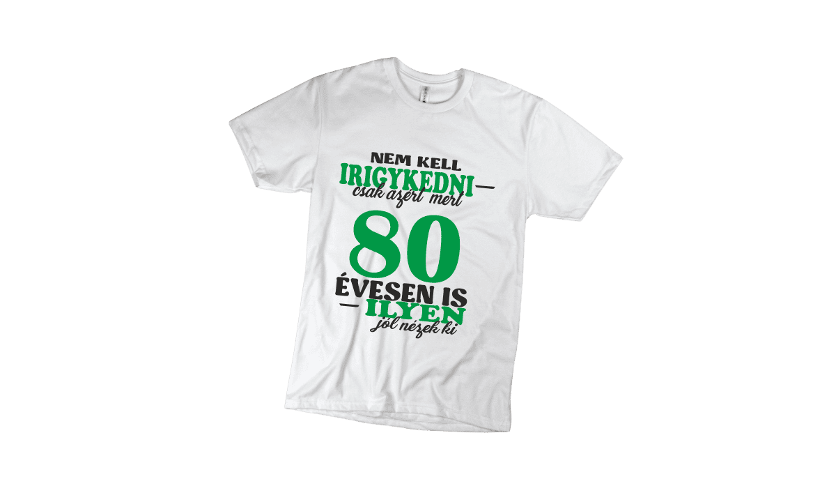 Nem kell irigykedni 80…(zöld) – férfi fehér póló. Tökéletes egyedi ajándék bármely alkalomra.
