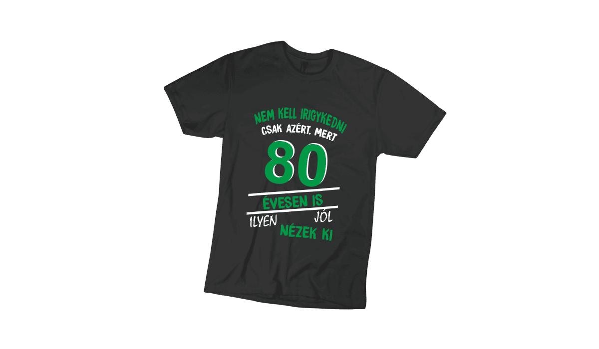 Nem kell irigykedni csak azért, mert 80…(zöld) – férfi fekete póló. Tökéletes egyedi ajándék bármely alkalomra.