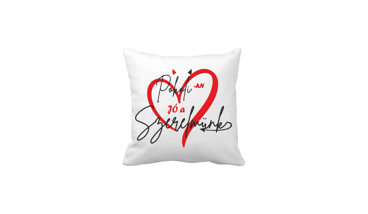 Pokolian jó a szerelmünk – vicces poénos párna termékkép. Egyedi, fényképes minta és felirat alapján készült. Állatos,vicces,poénos,fánkos,emoji,anyának,apának, és pénzes párnák nagy választéka. Bármely alkalomra tökéletes és különleges meglepetés.
