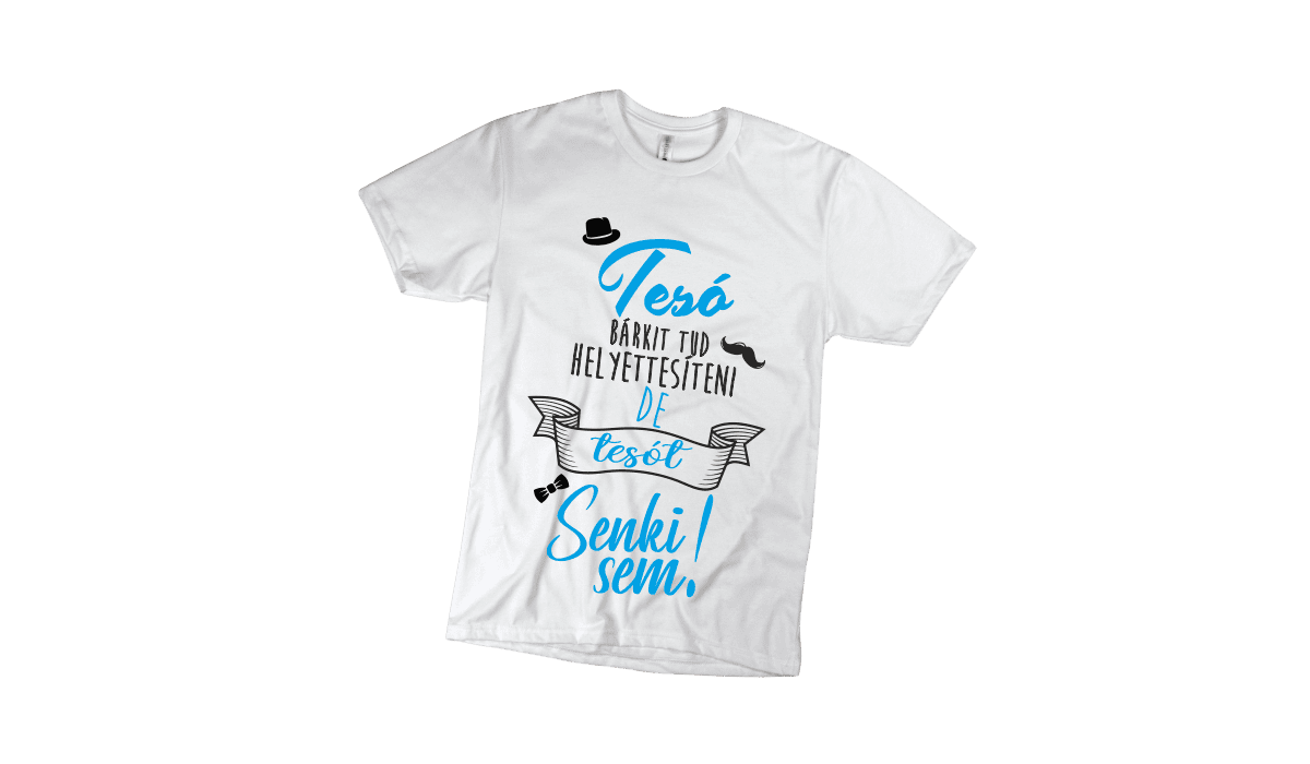 Tesó bárkit tud helyettesíteni… – férfi fehér póló termékkép. Tökéletes egyedi ajándék bármely alkalomra.